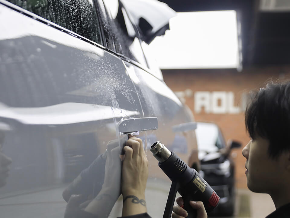 一般是用清水貼膜,需要兩個(gè)師傅配合施工。首先是用刮板從中心線往兩邊趕水,趕水時(shí)要注意避免回流造成氣泡。如果刮水比較干凈,可以做收邊處理。之后用烤槍把膜邊水分吹烤干,再將余下的邊進(jìn)行包邊粘貼,也用烤槍加熱使其牢固。