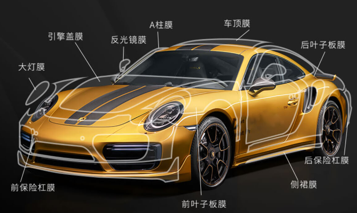 主要部位有:前后保險(xiǎn)杠、引擎蓋前緣、輪輞前緣、后視鏡外緣、車門外緣、A柱膜、車頂膜、大燈膜、車門內(nèi)緣門把手、后備箱和側(cè)裙膜、車門踏板等