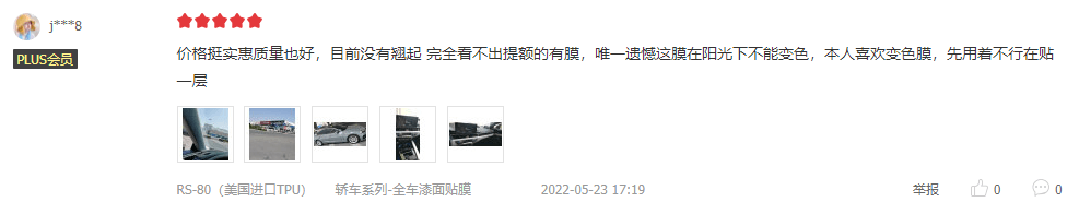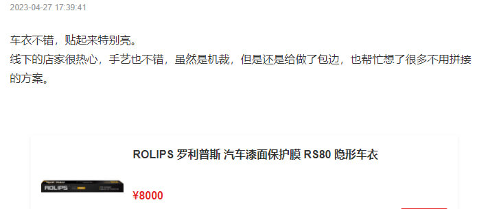 號稱進(jìn)口品牌中的性價(jià)比之王羅利普斯ROLIPS主打的車衣系列--基礎(chǔ)款RS80,RS80甄選全球優(yōu)質(zhì)的TPU,先進(jìn)納米涂層,Ashland(亞什蘭)壓敏膠,厚度多為8.0mil,質(zhì)保5年,價(jià)格8K。那么,這么一款高性價(jià)比的車衣,我們要聽聽車主怎么說?
