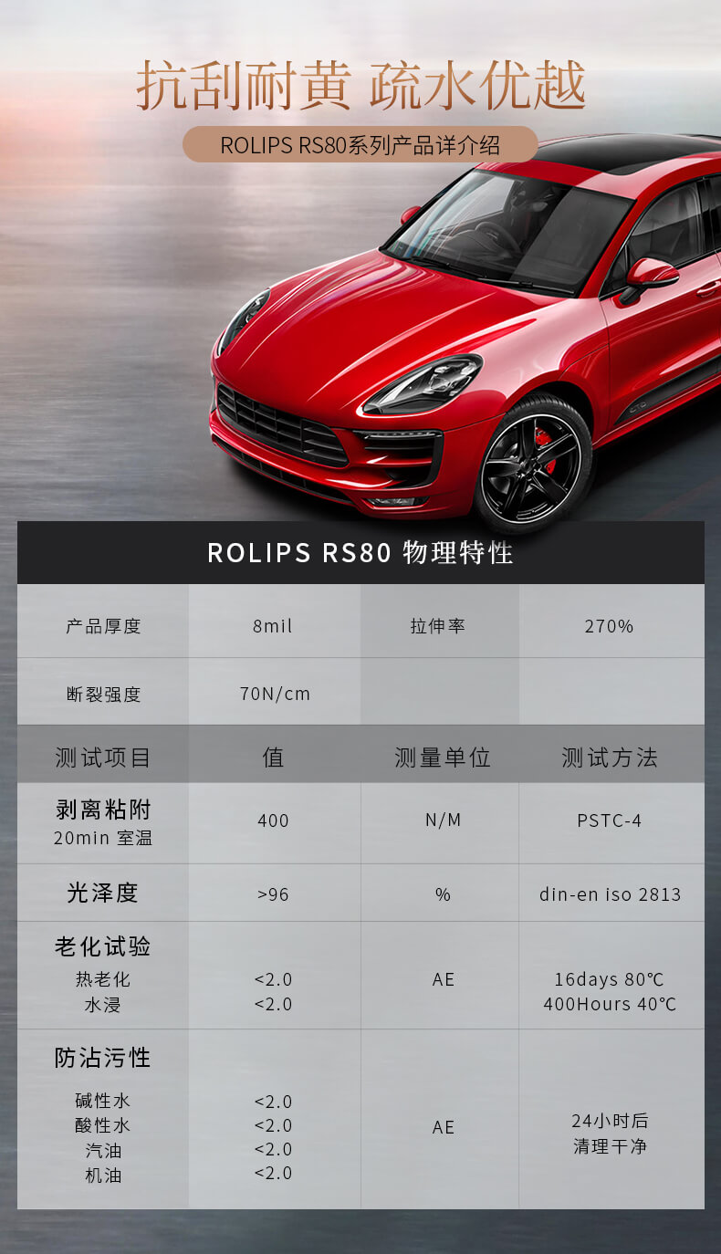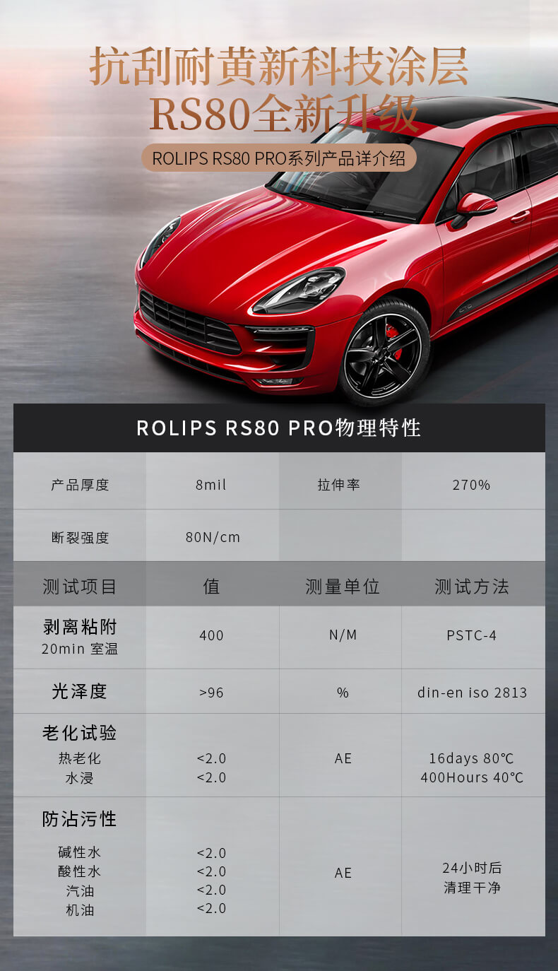使用改良TPU,分子結(jié)構(gòu)更穩(wěn)定,并且擁有卓越的高張力/高拉力/強韌/耐老化的特性,在基材方面比RS80略勝一籌,RS80pro厚度為8mil。雖然跟RS80是同一系列,但在漆面亮度方面能提升到30%,質(zhì)保6年。