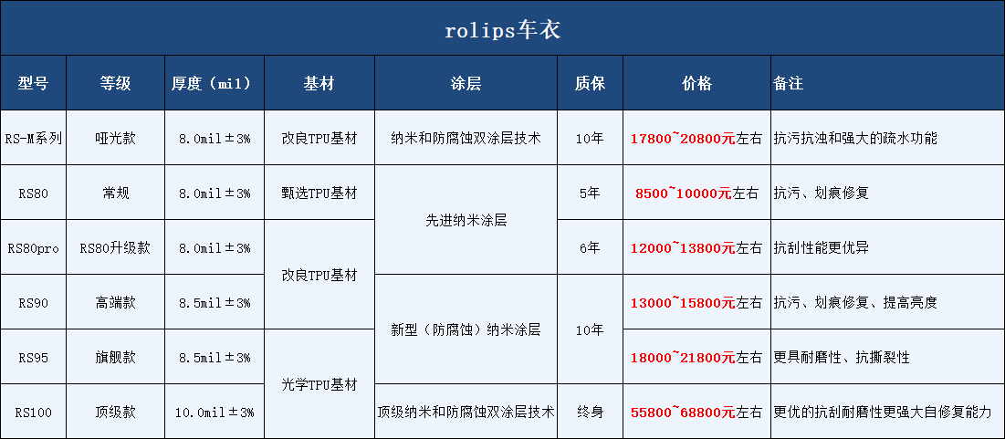 羅利普斯來源于美國,特點就在于質(zhì)保5-10年,耐腐蝕能力優(yōu)異,還有就是車衣膜厚,如果你的車經(jīng)常出現(xiàn)小剮小蹭,或者比較貴且非常愛惜的話,羅利普斯是您不錯的選擇。ROLIPS產(chǎn)品系列比較多,主要有RS80、RS80PRO、RS90、RS95、RS100、啞光系列等,那么,他們的價格是是多少呢?最新版來啦!