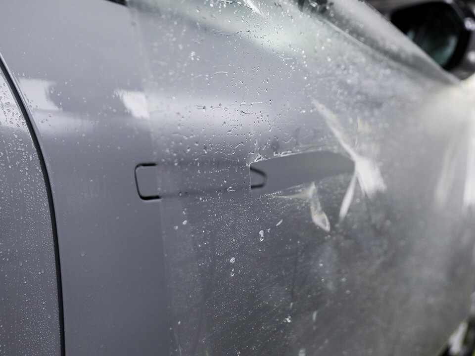 先用安裝液進(jìn)行清洗,在用清水沖洗掉安裝液。因為在施工之前要確保車身沒有一點污垢雜物,才能使得車衣與漆面更貼合,這樣后期不容易出現(xiàn)氣泡和翹邊情況。